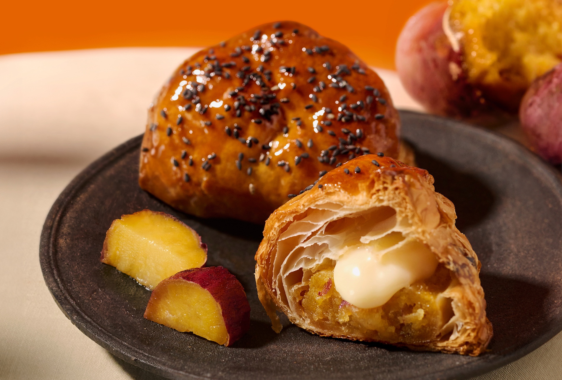 茨城県産の「べにはるか」を一定期間以上貯蔵させることで甘さとねっとり感を最大限に引き出した「紅天使」(※)を使用したあんを北海道産のミルキーなクリームチーズを使用したチーズムースに絞り、 さらにバターを乗せて焼き上げました。